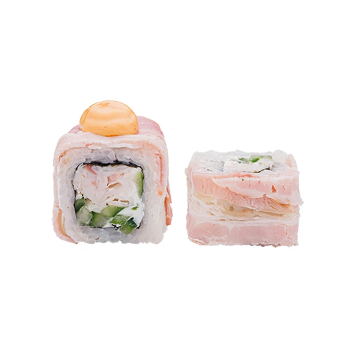 Состав: рис, бекон, сыр Cremette, курица варено-копченая, огурцы, соус спайс, нори. Внешний вид блюда может отличаться от фото на сайте. Выход: 216 гр. Годен 3 часа при t 20°C; 12 часов при t 4±2°C.