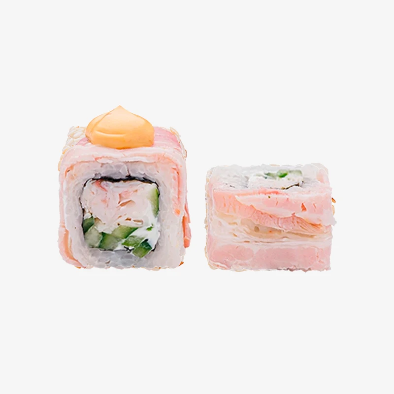 Состав: рис, бекон, сыр Cremette, курица варено-копченая, огурцы, соус спайс, нори. Выход: 216 гр. Годен 3 часа при t 20°C; 12 часов при t 4±2°C.