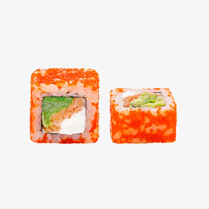 Состав: рис, икра масаго оранжевая, сыр Cremette, лист салата, лосось жареный, нори. Выход: 196 гр. Годен 3 часа при t 20°C; 12 часов при t 4±2°C.