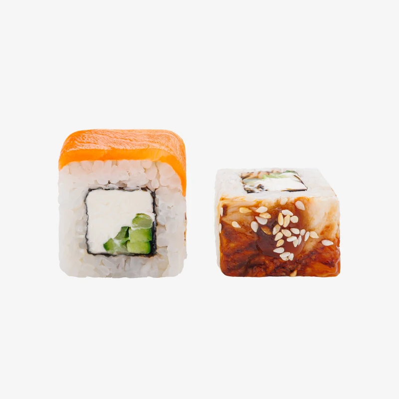 Состав: Филадельфия Лайт (4шт), Филадельфия с угрем (4шт) Рис, сыр Cremette, угорь, лосось слабосоленый, огурцы, соус унаги, кунжут, нори. Выход: 222 гр. Годен 3 часа при t 20°C; 12 часов при t 4±2°C.