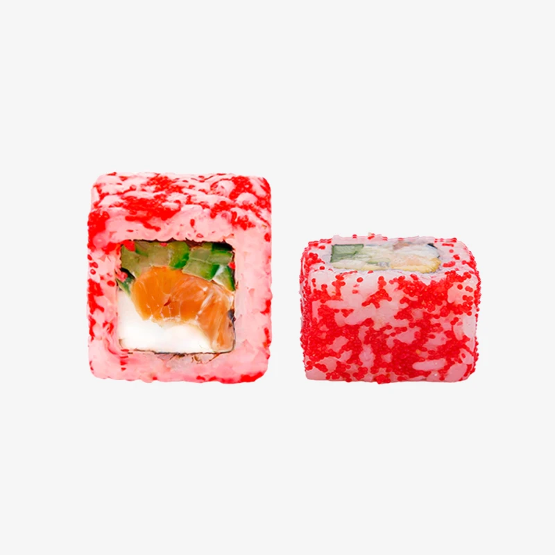 Состав: рис, икра масаго красная, сыр Cremette, лосось жареный, огурцы, нори. Выход: 196 гр. Годен 3 часа при t 20°C; 12 часов при t 4±2°C.