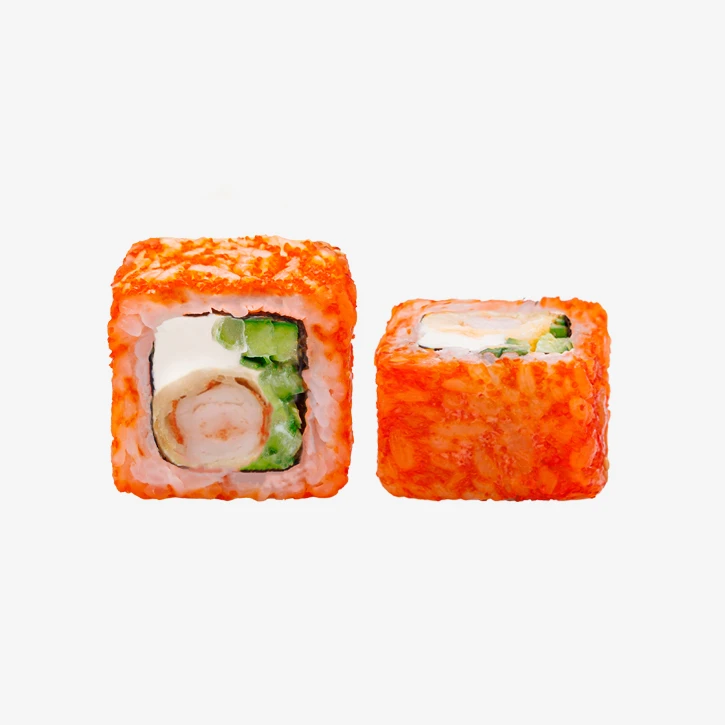 Состав: рис, икра масаго оранжевая, сыр Cremette, креветка в темпуре, огурцы, нори. Выход: 206 гр. Годен 3 часа при t 20°C; 12 часов при t 4±2°C.