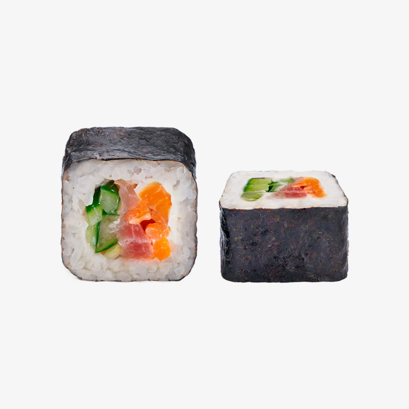 Состав: рис, лосось слабосоленый, тунец слабосоленый, сыр Cremette, огурцы, нори. Выход: 202 гр. Годен 3 часа при t 20°C; 12 часов при t 4±2°C.