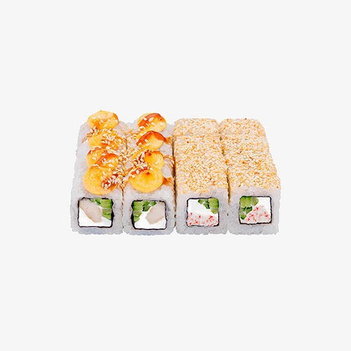 398 грамм, 2 вида, 16 кусочков Роллы: Калифорния в кунжуте Запеченные: Майами Годен 3 часа при t 20°C; 12 часов при t 4±2°C.