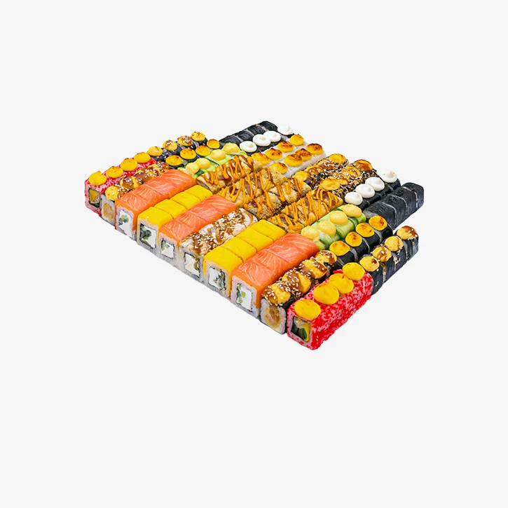 3111 грамм, 14 видов, 112 кусочков Роллы: Сливочный огурец, Весна, Филадельфия Дуо, Лотос, Сырный, Филадельфия Запенные: Шеф хот, Гурман, Краб Луи, Лосось Чиз, Креветка Чиз, Эби Жареные: Рэд Темпура, Бекон Темпура Годен 3 часа при t 20°C; 12 часов при t 4±2°C.