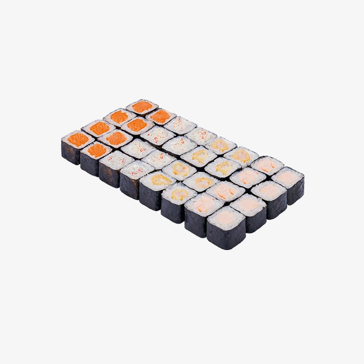 500 грамм, 4 вида, 32 кусочка Роллы: Мини цыпа, Мини лосось, Мини краб, Мини креветка. Годен 3 часа при t 20°C; 12 часов при t 4±2°C.