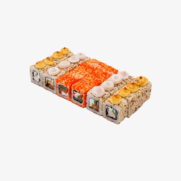 619 грамм, 3 вида, 24 кусочка Роллы: Латино, Калифорния с лососем. Запеченные: Аляска. Годен 3 часа при t 20°C; 12 часов при t 4±2°C.