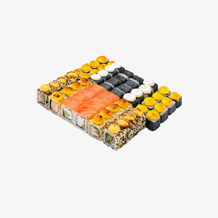 1356 грамма, 7 видов, 56 кусочков Роллы: Сливочный огурец, Сливочный лосось, Филадельфия лайт Запеченные: Мини краб Хот, Мини угорь Хот, Аляска, Запеченый Тунец. Годен 3 часа при t 20°C; 12 часов при t 4±2°C.