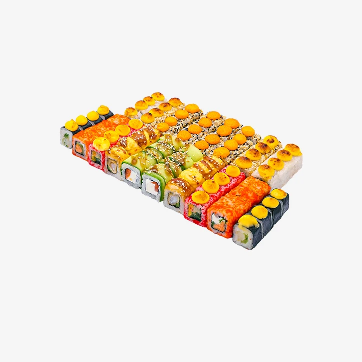 1931 грамм, 9 видов, 72 кусочка Роллы: Чак, Мексика, Филадельфия Грин Запеченные: Майами, Такао, Аляска, Тарантино, Тигра, Шеф Хот. Годен 3 часа при t 20°C; 12 часов при t 4±2°C.