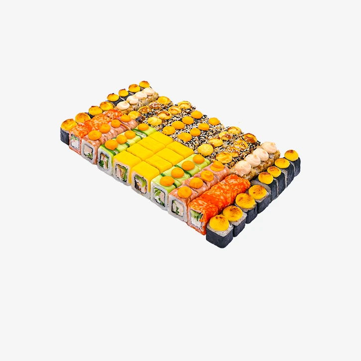 2059 грамма, 10 видов, 80 кусочков Роллы: Калифорния ролл, Тиффани, Мексика, Бекон, Цезарь, Бонито с крабом Запеченные: Лосось Чиз, Эби, Аляска, Мини краб Хот. Годен 3 часа при t 20°C; 12 часов при t 4±2°C.