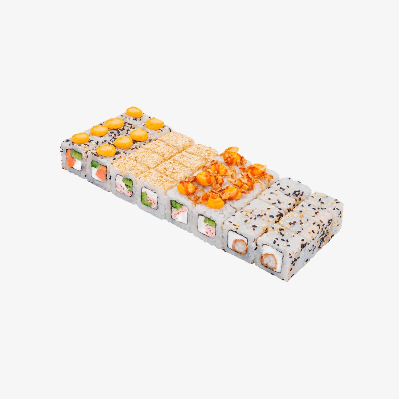 788 гр, 4 вида, 32 кусочка Роллы: Калифорния в кунжуте ролл, Нежная креветка, Умка ролл, Криспи ролл. Годен 3 часа при t 20°C; 12 часов при t 4±2°C.