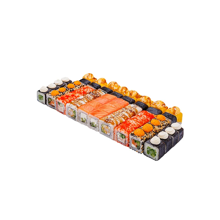 1429 грамма, 7 видов, 56 кусочков Роллы: Калифорния с курицей, Дракон, Сливочный огурец, Филадельфия лайт, Филадельфия с угрем лайт Запеченные: Тарантино, Тигра. Годен 3 часа при t 20°C; 12 часов при t 4±2°C.