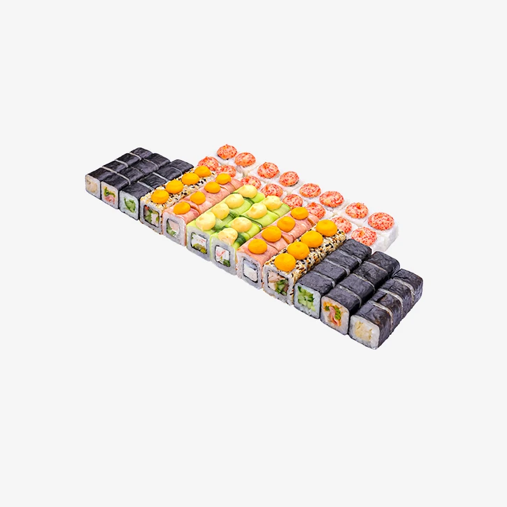 1532 грамм, 8 видов, 64 кусочка Роллы: Лава с крабом, Лава с окунем, Лотос, Дракон, Мексика, Бекон, Огурец, Мини окунь. Годен 3 часа при t 20°C; 12 часов при t 4±2°C.