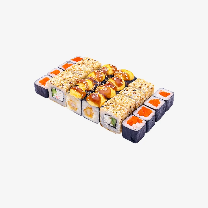 505 грамм, 3 вида, 24 кусочка Роллы:Нежный краб, Мини лосось Запеченные: Креветка Чиз. Годен 3 часа при t 20°C; 12 часов при t 4±2°C.