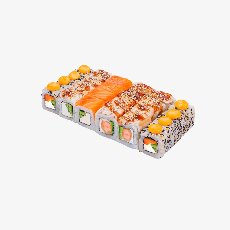 647 гр, 3 вида, 24 кусочков Роллы: Филадельфия Дуо ролл, Умка ролл, Канада с креветкой ролл Годен 3 часа при t 20°C; 12 часов при t 4±2°C.