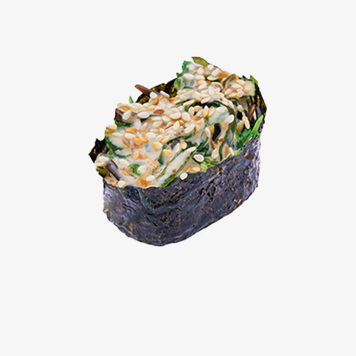 Состав: рис, салат чукка, ореховый соус, кунжут, нори. Выход: 51 гр. Годен 3 часа при t 20°C; 12 часов при t 4±2°C.
