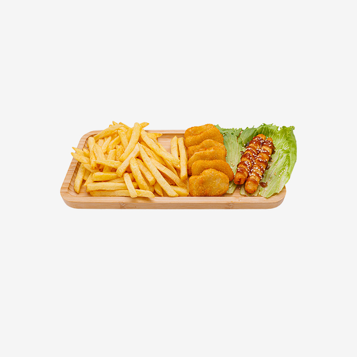 Состав: Картофель фри, креветка темпура, наггетсы, лист салата, соус унаги, кунжут. Выход: 216 гр. Годен 3 часа при t 20°C; 12 часов при t 4±2°C.