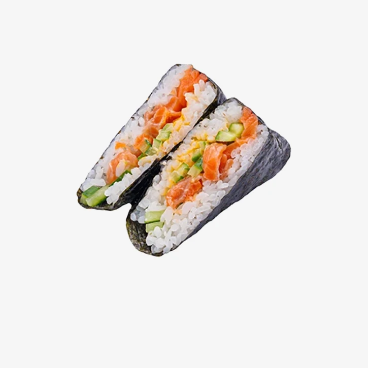Состав: рис, лосось слабосоленый, огурцы, соус спайс, нори. Выход: 105 гр. Годен 3 часа при t 20°C; 12 часов при t 4±2°C.