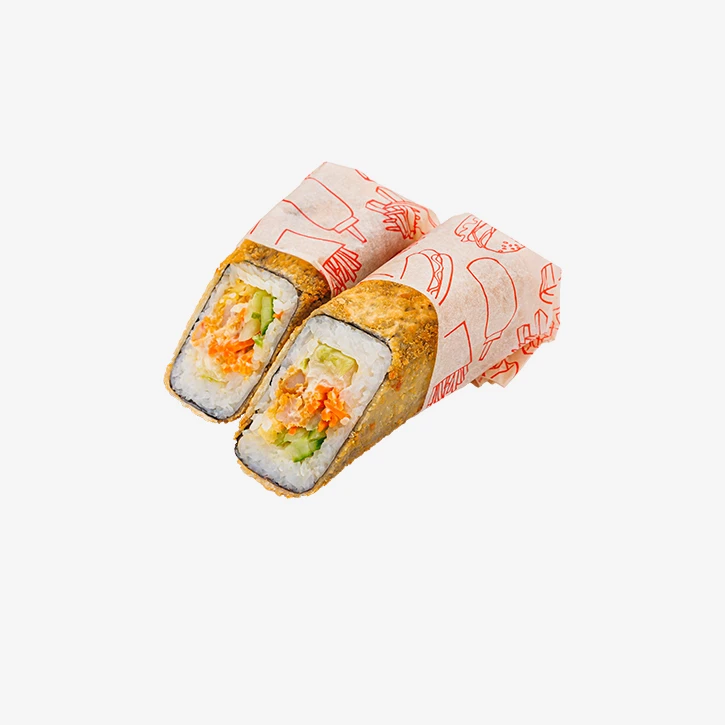 Состав: рис, креветка в темпуре, морковь по-корейски, огурцы, лист салата, сухари панко, кляр, соус фирменный, нори. Выход: 288 гр. Годен 3 часа при t 20°C; 12 часов при t 4±2°C.