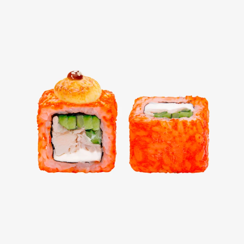 Состав: рис, сыр Cremette, икра масаго оранжевая, курица варено-копченая, огурцы, соус для запекания, соус унаги, кунжут, нори. Выход: 227 гр. Годен 3 часа при t 20°C; 12 часов при t 4±2°C.