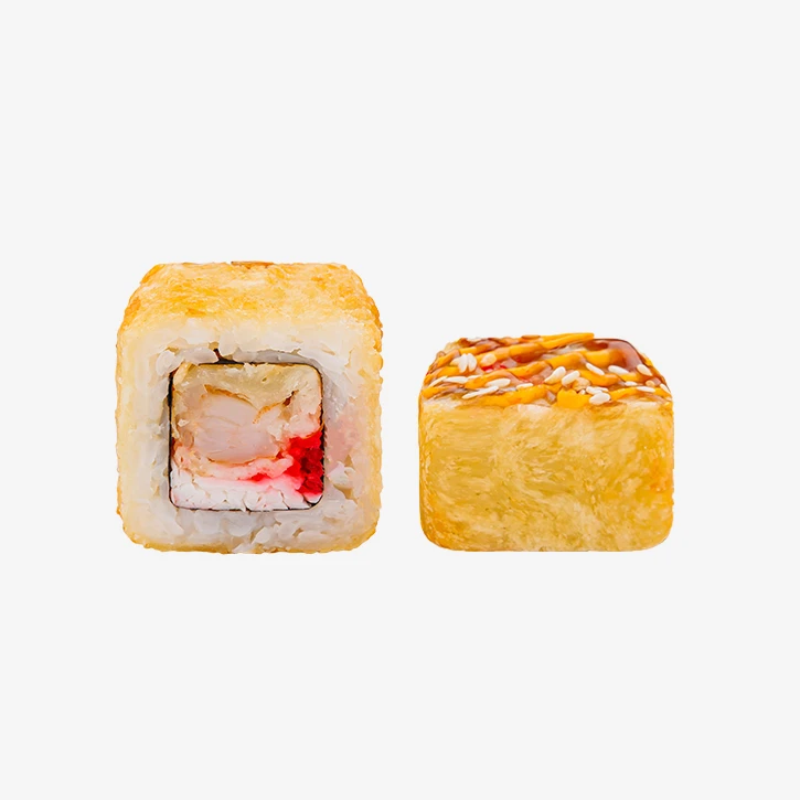 Состав: рис, креветка в темпуре, крем-краб, сухари панко, кляр, соус унаги, соус спайс, кунжут, нори. Выход: 242 гр. Годен 3 часа при t 20°C; 12 часов при t 4±2°C.