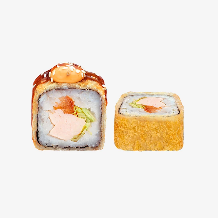 Состав: рис, помидоры, лист салата, курица варено-копченая, сухари панко, кляр, соус спайс, соус унаги, кунжут, нори. Выход: 253 гр. Годен 3 часа при t 20°C; 12 часов при t 4±2°C.
